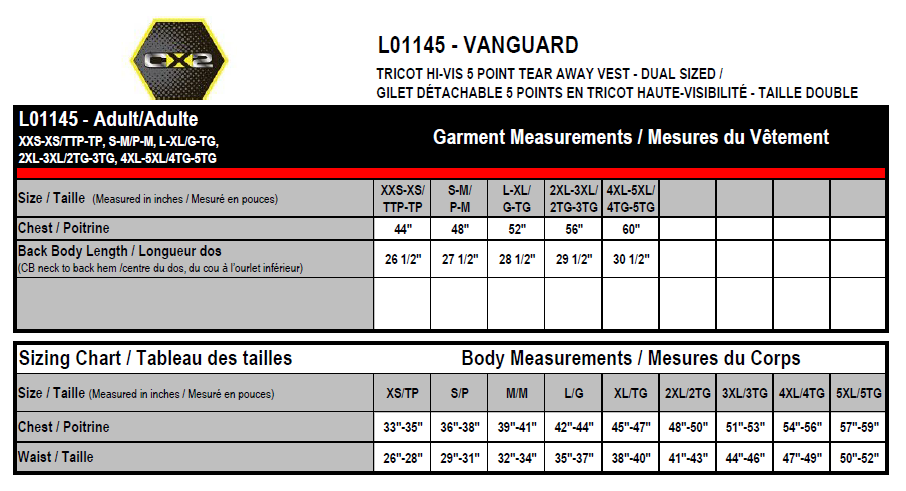 130 GSM - 3.8 oz./yd2 - 6.5 oz./lin. yd. 100% polyester tricot knit. 5-point tape fastener tear-away safety design. 4 front storage pockets.  Reflective radio clip strap on front shoulders. Durable binding. D-ring access slot on back. 2" retroreflective stripe with 4" fluorescent background stripe on front and back body. Meets CSA standards.